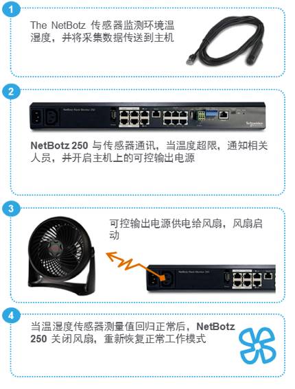 作为原NBRK0201的升级版,NBRK0250也保留了其特色功能:220V的电源输出,可用于与传感器的联动。可应用于低密度IT机房的补充制冷。示例场景: